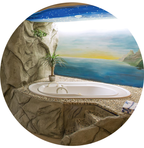 Surrealer Indoor-Sandy-Beach mit feinstem Karibiksand unter Deinen Füßen, Fantasy-Airbrush-Story, cozy daybeds, Jungleatmo für Deinen perfekten Tag am Strand.